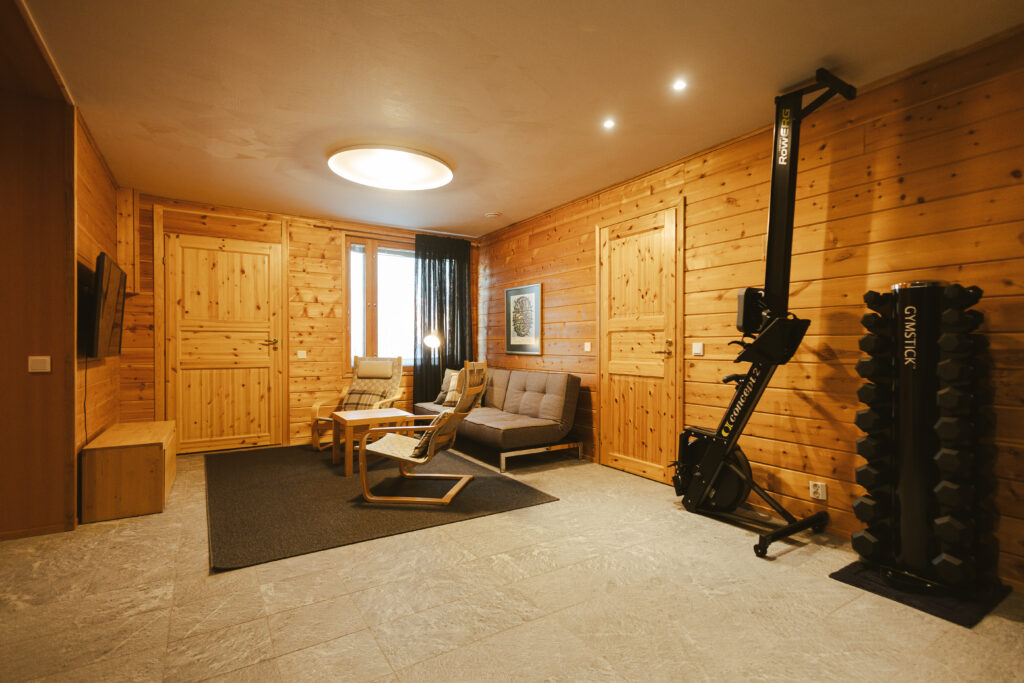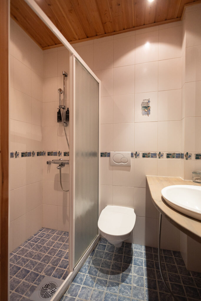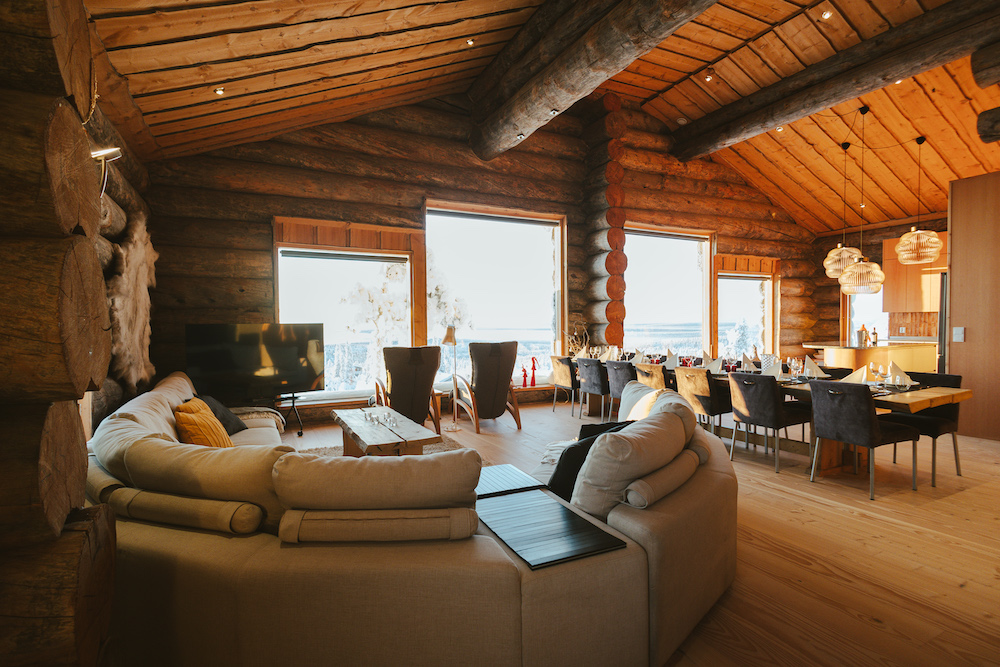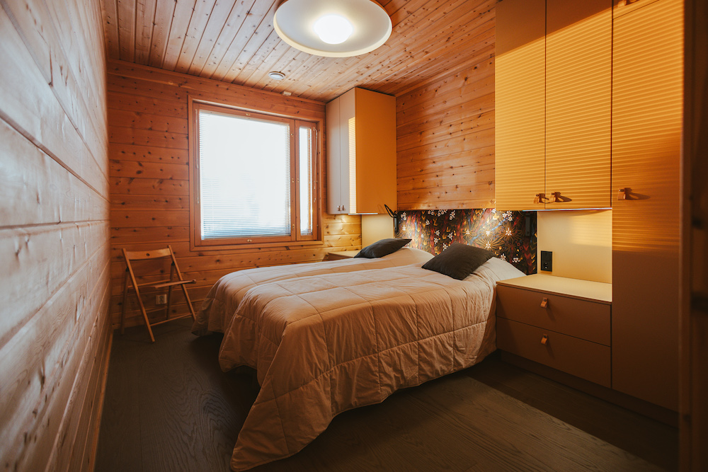 Yläkerrassa on oleskelutilojen lisäksi 3 makuuhuonetta kelohirsiseinin. Alakerrassa on 5 makuuhuonetta hirsipaneeliseinin. Kaikissa makuuhuoneissa on kaksi sänkyä, oma wc ja suihku.
