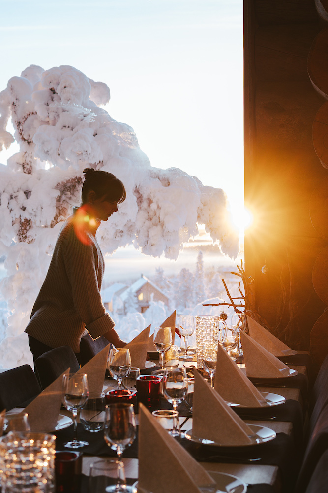 Sisääntulokerroksessa on avara oleskelutila, joka soveltuu myös kokoustilaksi tai juhlasaliksi. Oleskelutilassa on 14 hengen ruokapöytä, sohvaryhmä, takka, nojatuoleja ja avokeittiö.